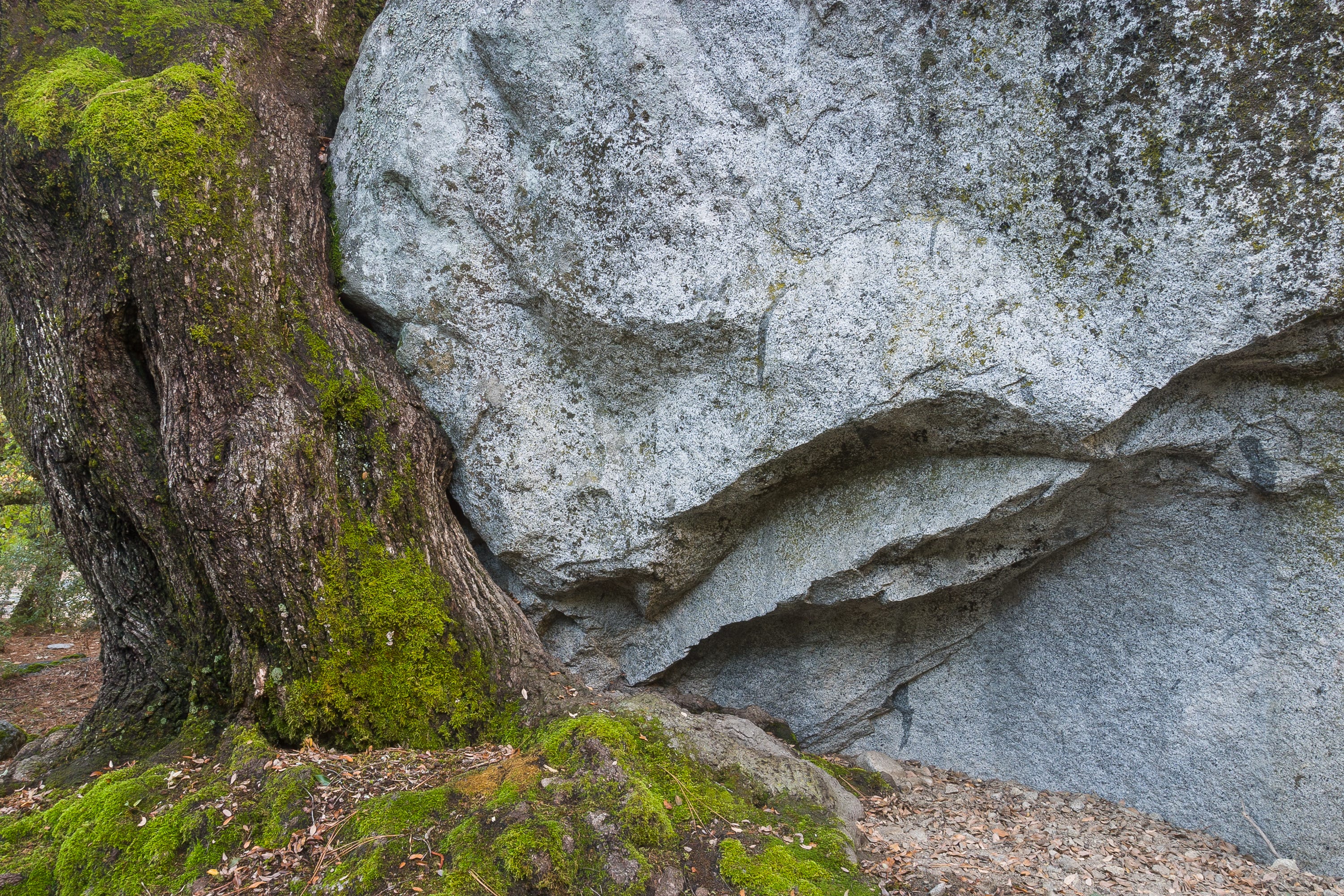 In the image below, one asks the question: Which happened first? Did the tree grow and then the rock fell and pressed against it? Or did the tree grow around the rock. Of course the latter is the answer, but at first, you pause to wonder because the tension is felt when you look at the photo. It feels like the rock is really pushing against that oak, and that is what grabbed my attention. I only had to choose the proportion of the rock vs. tree to create a sense of power in the rock to express my vision of this scene.