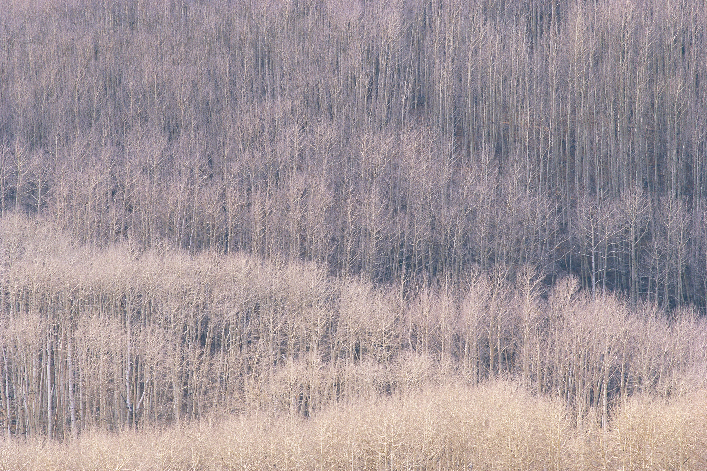The photograph below made me screech to a halt while driving over this mountain in Utah. You come over the hill and there is this view in late autumn when all the leaves are gone. There is a pullout there but you can easily miss it when your eyes are wide from this view. Well, that’s how I felt about it anyway. My vision was to share how beautiful trees can be even when naked, how you see the bones of the forest when bare. I knew I needed to use a telephoto lens to frame just a section of the huge grove on the hillside, to simplify the scene yet still capture the mass of it. In the soft light of a November afternoon, they took on a silvery hue.