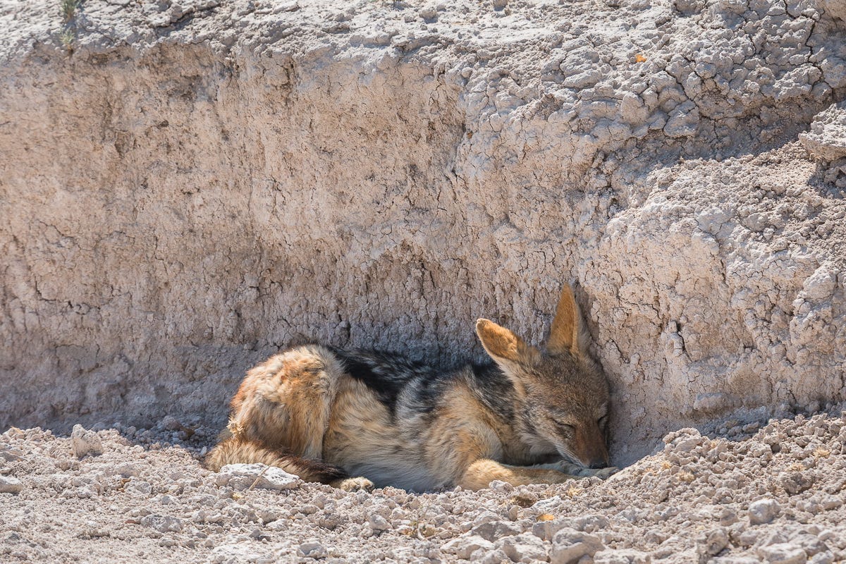 This black-backed jackal in Namibia was desperately wanting shade in which to take a nap. When we discovered it, it was scorching up tightly against the wall of this dry wash to try and put itself in the shade as much as possible. When it settled and closed its eyes, I felt what it felt, ‘finally, a cooler place to nap’. I hope that got expressed in this final image.